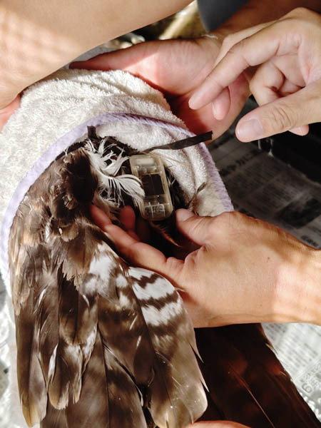 本番では結び目を木綿糸で縫って固定しますが、今回は縫っていません。木綿糸は劣化によって1年後ぐらいに切れ、結び目もほどけてGPSタグが自然落下することを狙っていますが、しばらく装着したままにして、どれくらい結び目がゆるむかも確認したいと思います。あとは股ズレがないかどうかなどなど、しばらくはこのトビに体を張って頑張ってもらうことになります。