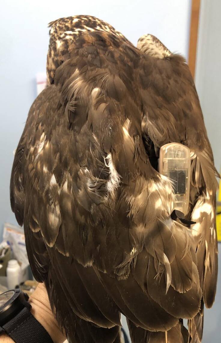 トビでは実験して問題なかったのですが、やはり本番前にサシバで装着実験を行いたかったので、地元の獣医師の方にお願いをして装着させていただきました。見たところ問題は無さそうですが、皮膚が擦れてしまったり脱落したりといったトラブルが起きないか数日観察していきます。