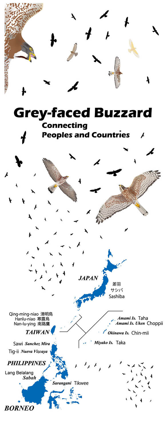 今回はバンダナのご紹介です。昨年のデザインをバンダナ用に作り変えました。支援者数に合わせて発注するので、デザインのみとなりますが、大きく違うのはボルネオが入ったことです。ボルネオのSabahにもサシバが少数越冬するそうですが、サシバのことをLang Belalangというそうです。