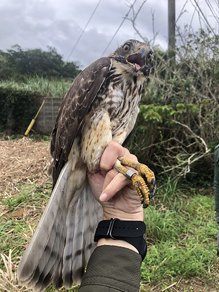 他のメンバーも合流し、準備万端と捕獲を始めましたが、サシバは何故か近くまで来るのにバッタに近づいてくれません。最悪の結果が頭をよぎる中、突然待機していたメンバーが走り出しました!通りがかりの地元の人たちが何が起こったのかと振り返る中、無線で捕獲成功の知らせ!この嬉しい第一号が川上①でした。