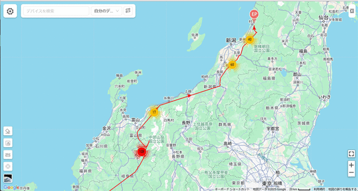川上⑤はデータが送られてきませんでした。龍郷小と湯湾は昨日と同じ場所にいます。湯湾がいる場所は山間ですが水田が広がっているので、もしかしたら繁殖地の可能性もあるのかもしれません。ただ、天気はよくないので、晴れれば動くかもしれませんね。