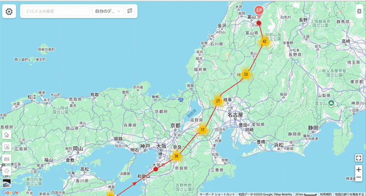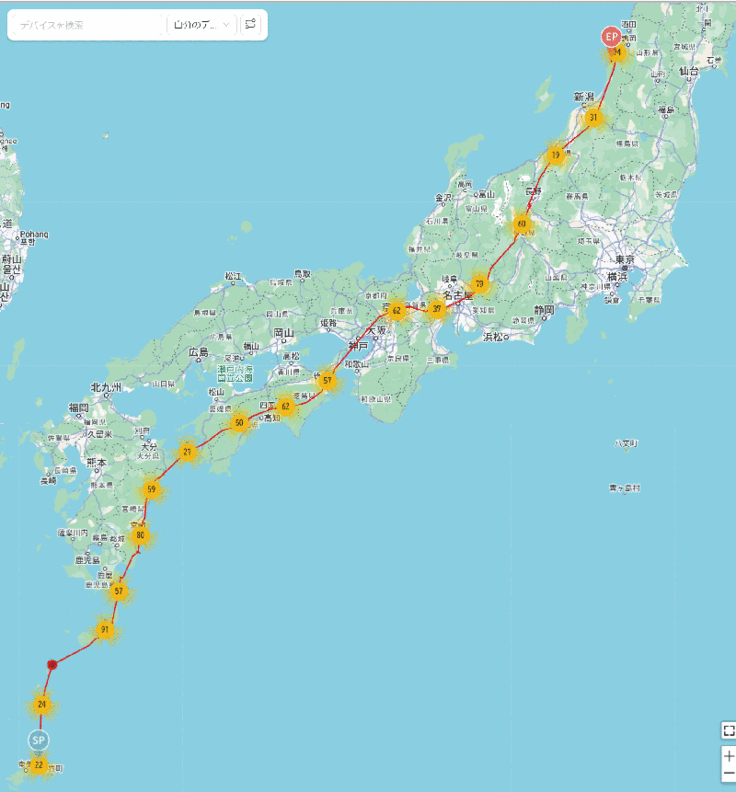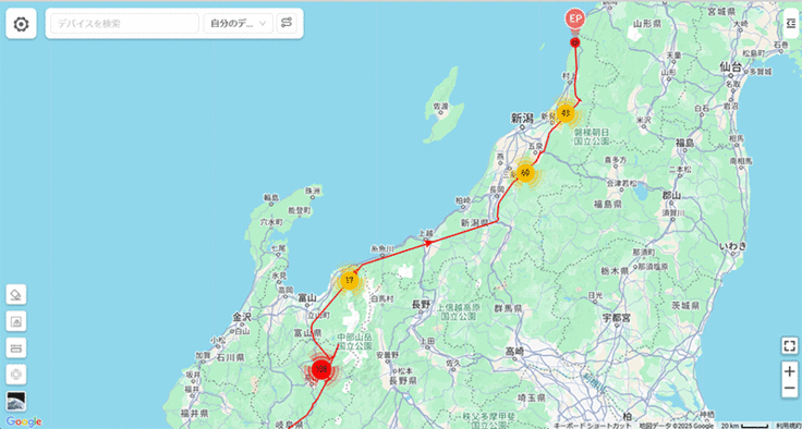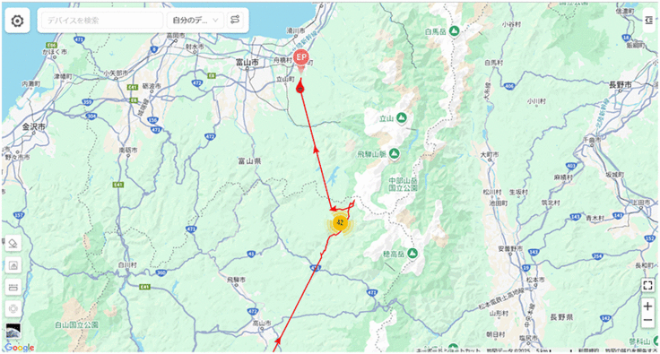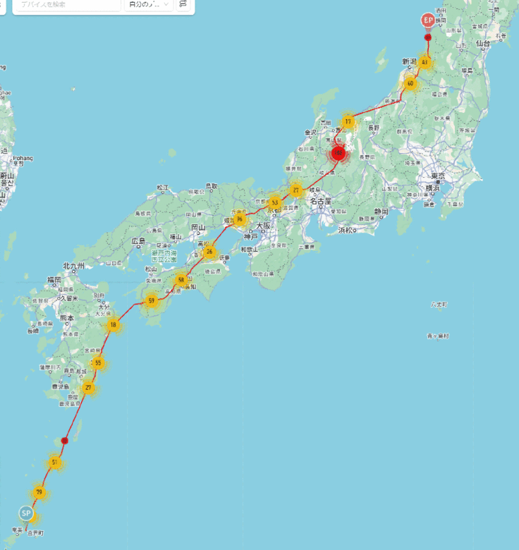 宇宿①は昨年の到着地の手前で止まっていたので、もう動かないのかと思っていたら急に移動して昨年と同じ場所(新潟県側)に到着しました。ずいぶんゆっくり進んだなと思って昨年のデータと比較したら、なんと昨年も4月4日に到着(驚)!費やした日数は昨年は7日なのに対して今年は12日かけています。出発が早かった分を手前で調整したのか。。。興味津々です。