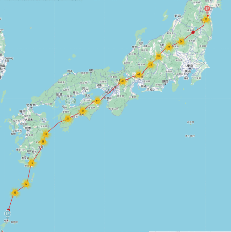 そのほかスイセイは四国に入り、ツムグは長野県まで到着しています。生勝①は琵琶湖の北側を通っていますね。