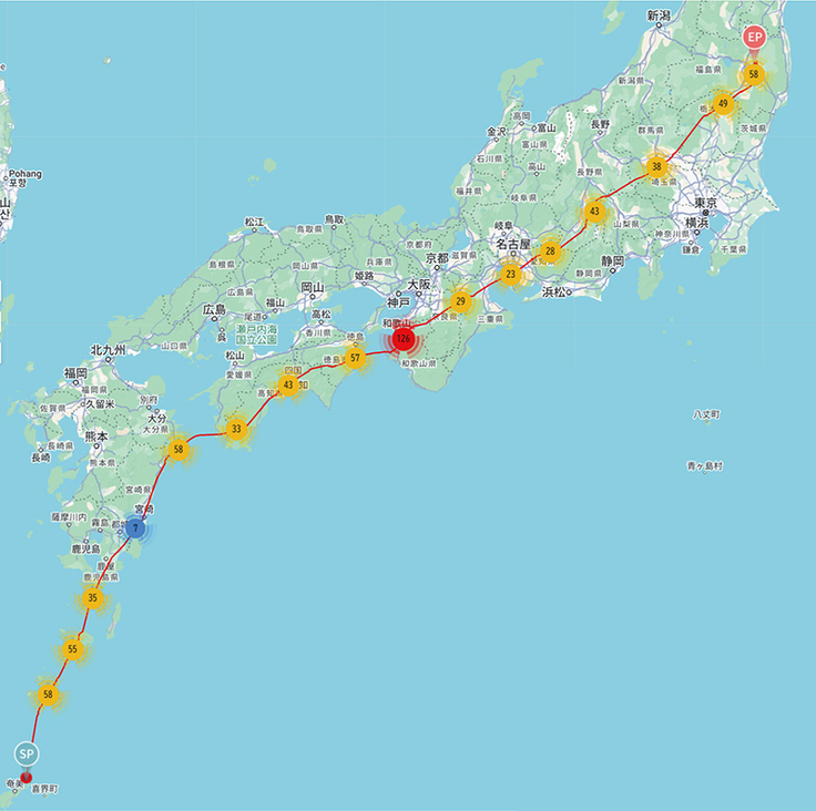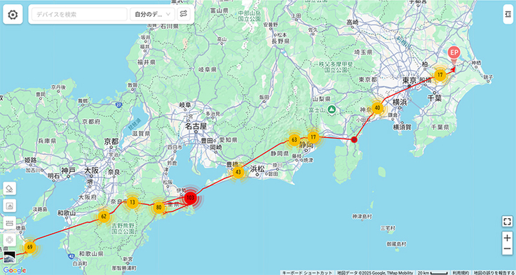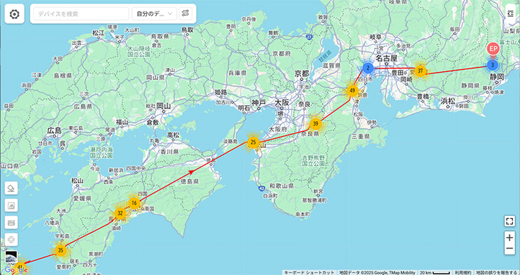 3月30日を最後にデータ更新がなかったので、GPSタグが脱落したと思われていた川上⑤からデータが来ました。なんと脱落したと思われていた場所から少し進んだ場所で落ち着いていたようで、おそらく森の中に入ったことでデータが来なくなっていたと思われます。3月24日出発で3月31日到着。場所は愛知県。移動距離は短いですが、7日間の旅路でした。昨年は8日間かけて福島県まで移動し、そこでは繁殖したと考えられています。これまで繁殖したと思われる個体はピンポイントで同じ場所に戻るものばかりだったので、そういうものだと思っていましたが、ここにきて場所を変えるという新しい事例が出てきました。