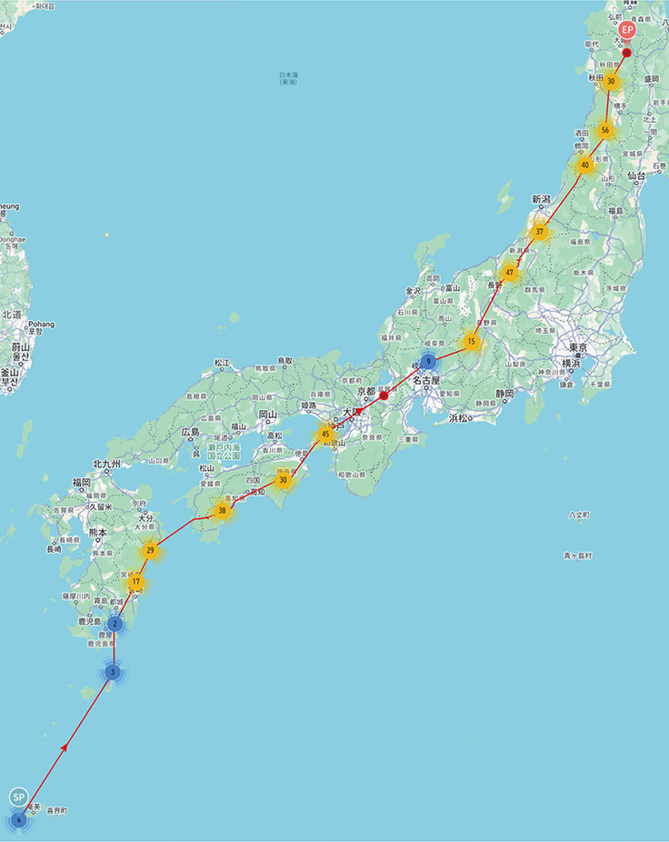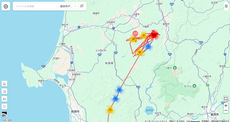 阿室③は迷走が止まらないので、秋田県のこのエリアに到着した4月19日を到着日としていったんまとめたいと思います。4月9日に移動開始し、4月19日に到着。10日間かけての旅路でした。このあとどこかに落ち着くのか、または迷走を続けるのか、随時お知らせしていきたいと思います。阿室①は今日はデータが来ていませんが、こちらも迷走が続くようであれば、いったんまとめたいと思います。