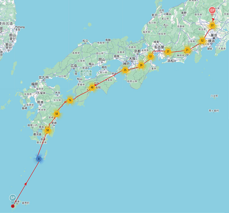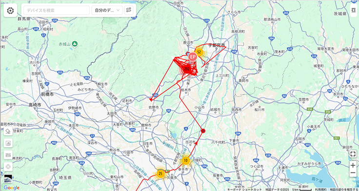 部連①は同じ場所を行き来しているということでお伝えしていましたが、一つ一つデータを見てみると、片方はねぐら、片方が餌場となっているようです。毎日10km以上移動して餌場に通っていることになります。♀個体がそんなに遠出しているということは繁殖はしていないと思いますが、最初にねぐらとしているエリアに到着した日を到着日としておきたいと思います。また違った動きが出てきたらご報告します。4月14日出発で4月30日に栃木県に到着。16日間かけての旅路でした。