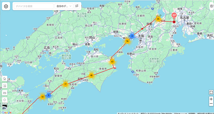 名柄はやはり淡路島を通って本州入りしました。和歌山県から太平洋側を進むと思いきや淡路島経由で琵琶湖に入りましたが、琵琶湖の途中から琵琶湖を横断して山地を越え、名古屋方面に抜けました。これまでほかの個体ではこういった動きは見られなかったので、面白い動きだと思います。思い直してか間違えたことに気づいたのか、太平洋側へ方向修正した可能性もあります。今後の動きに注目したいと思います。