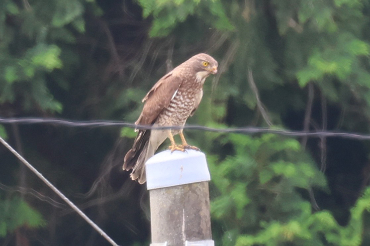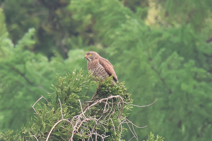 部連①は耕作地が広がる平野部の中にぽつんと残る緑地で、スギ・ヒノキや落葉広葉樹、竹などが混在している場所でした。おそらく農家のご自宅の裏なので、私有林だと思います。残念ながらここも部連①を確認はできませんでしたが、相手のオスと思われる個体が周りで一生懸命餌を捕っていました。結果的に餌運びまでは見られませんでしたが、ここも繁殖をしていそうです。