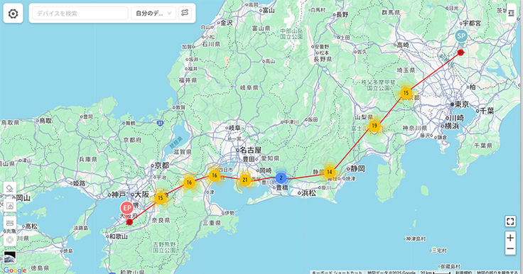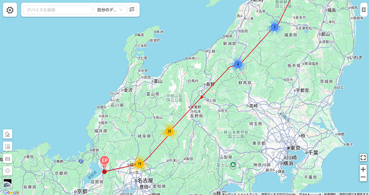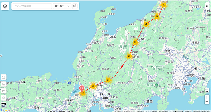 龍郷小も昨年と全く同じ場所に滞在を始めましたが、昨年は川上③と同じ10月6日に出発しています。距離も近いので何か渡りを促す要因があるのかもしれないですね。昨日お伝えした長期滞在の中継地がもう一つあるかもと書いた件ですが、昨年のデータを見ると、そもそもルートが違っており、昨年はそこを通っていないようです。昨年は琵琶湖の北側を通過しましたが、今年は南側を通過しています。長期滞在したかどうかについては、その場所に9月3日に到着して、9月16日までは点が落ちているので、長期滞在場所とするかどうかは微妙なところです。ただ、倉敷に落ちている最初の点は9月22日であり、この間がどっちにいたのかでも考え方が変わりそうです。とりあえずは長期滞在場所としては扱わないということで整理したいと思います。