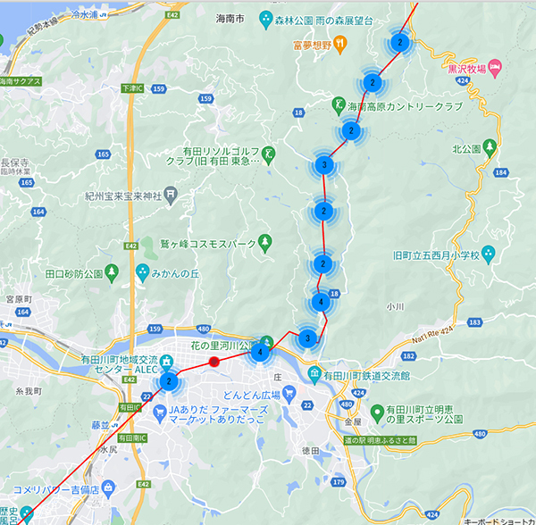 では地図上に出ている黄色い丸と数字は何かですが、これは位置情報が密集している場合に省略する形で表示されます。つまり数字はそのあたりにその数だけ位置情報があるということです。