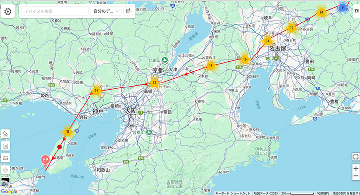 千葉北③が数日ぶりにデータが来ましたが、すでに三重に渡っていました。そして待ち望んだ伊良湖岬通過!渡りと言えば伊良湖岬であったころ、多くの個体がこのルートを通っていたはずです。気候変動等で変わってきたのだと思いますが、このルートを見ると嬉しくなります。