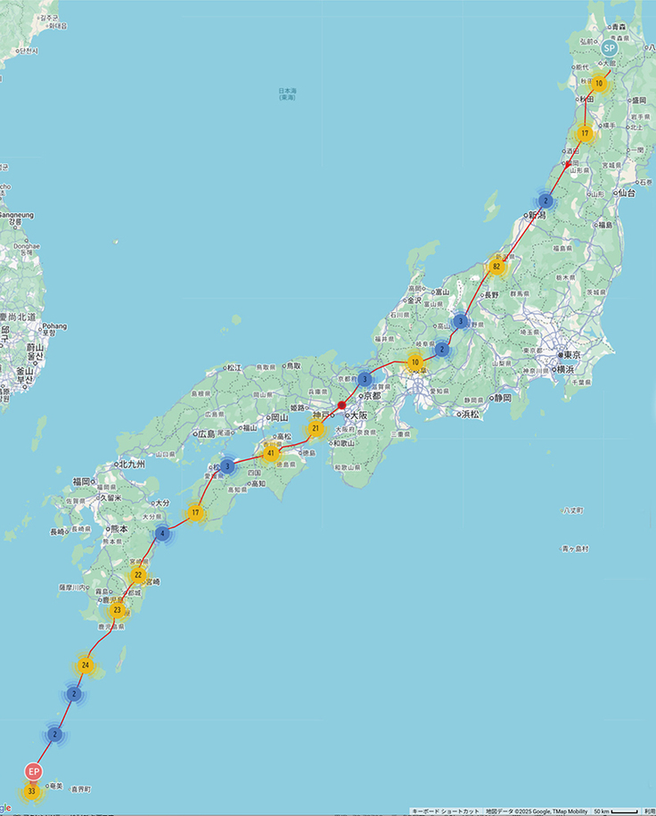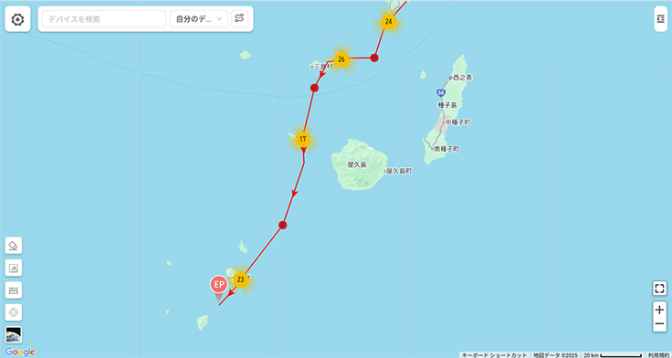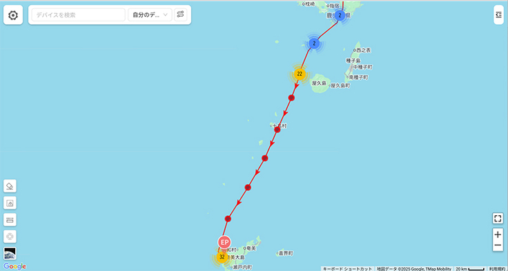 これに対して阿室③が先に奄美大島に到着しました。越冬地にピンポイントで戻ってきています。2羽でのゆっくりとした移動でしたね。阿室③は中継地から32日間かけての帰路でした。