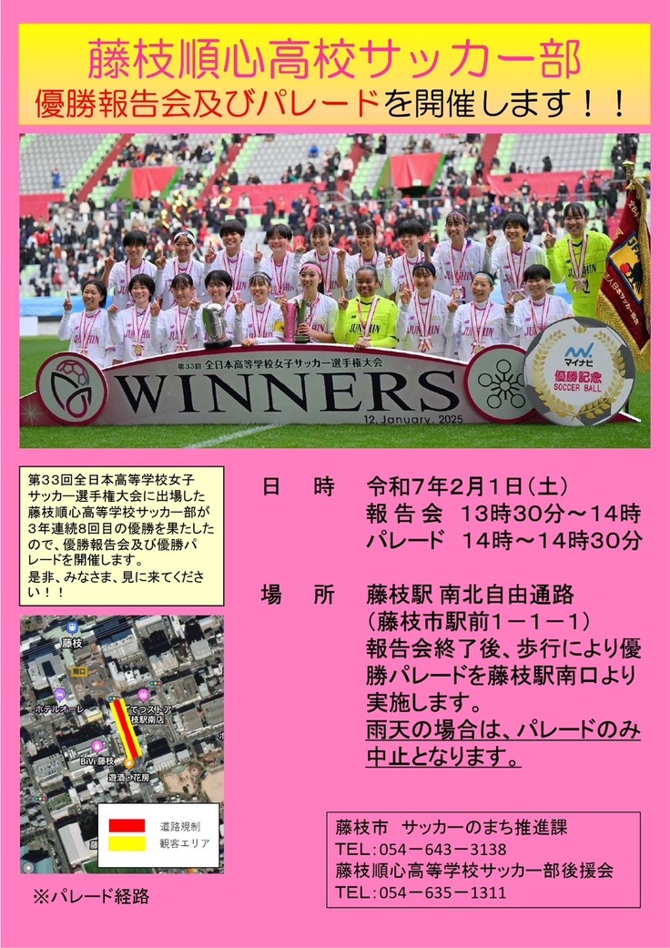 今回の優勝につきまして、藤枝市より「優勝報告会および優勝パレード」を開催する旨の連絡がございましたので、ご案内申し上げます。
