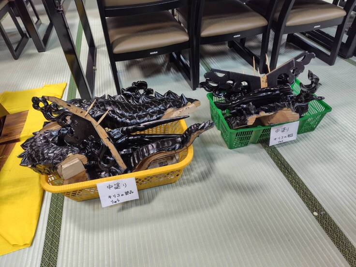 今回の震災で工房の建物も被災している関係で、キリコや曳山の修復作業はまだ再開されていません。それでも、小さい物の作業は少しずつ進められている状況でした。