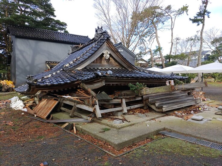 地震直後、後ろ方向へパタンと倒れたところに屋根が乗っかって、ある意味「キレイ」な状態で潰れていました。
