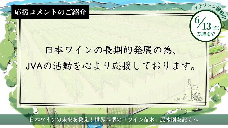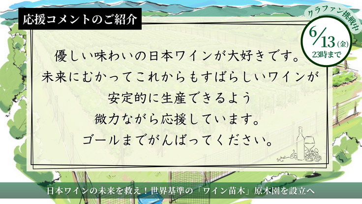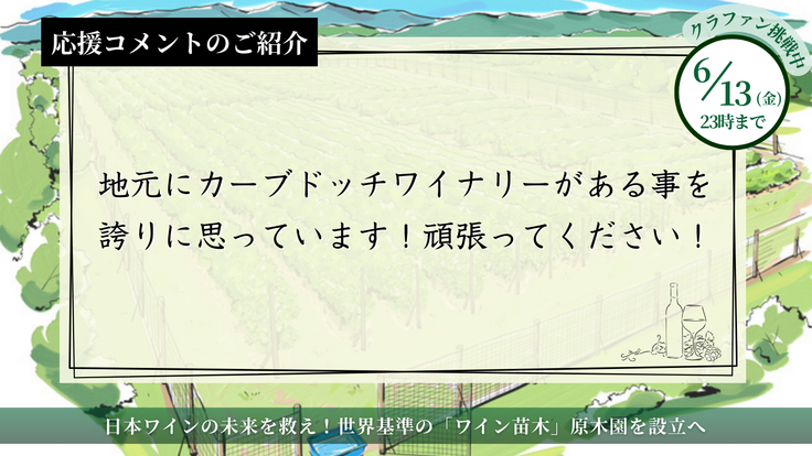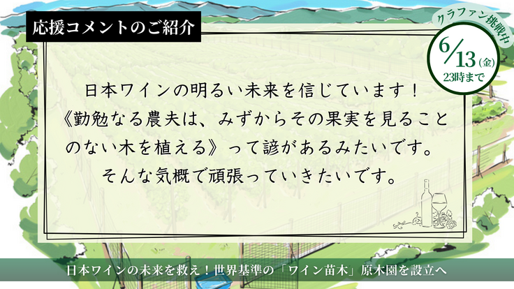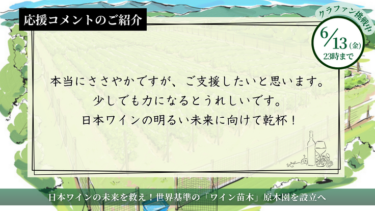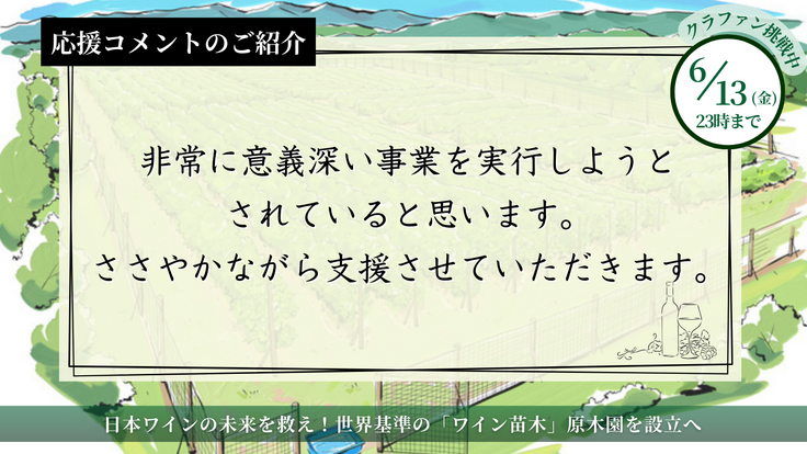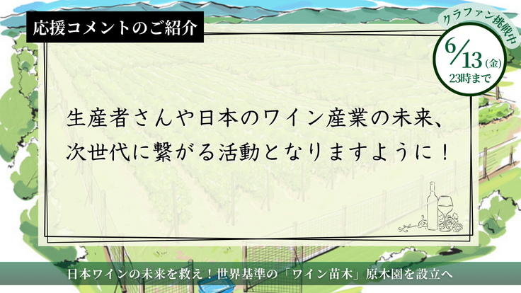 残り期間はわずか28日間となりました。どうか、引き続きご支援・ご拡散による応援を賜れますよう、心よりお願い申し上げます。日本ワインの未来を支えるこの挑戦に、最後までご一緒いただけますと幸いです。