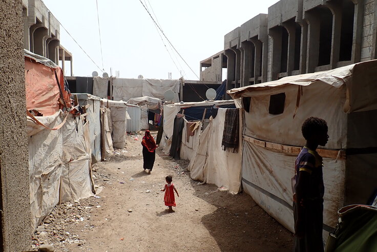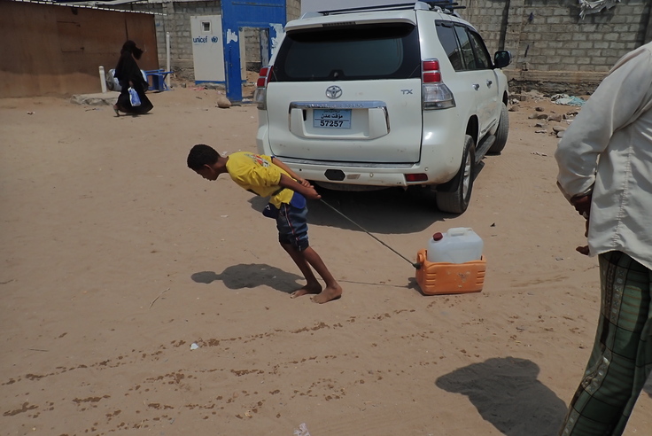 アデン市内の国内避難民居住サイトで、水を運ぶ少年
