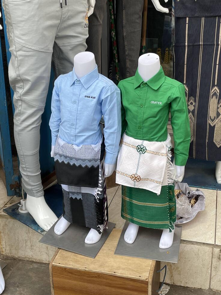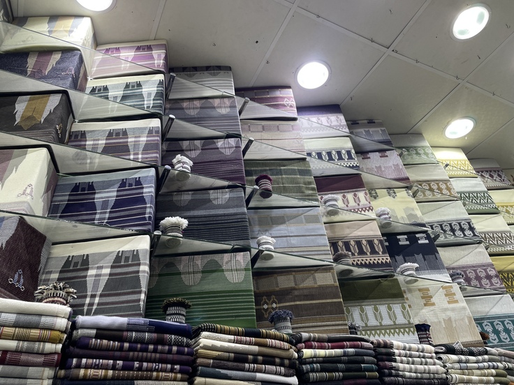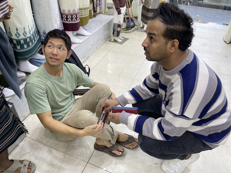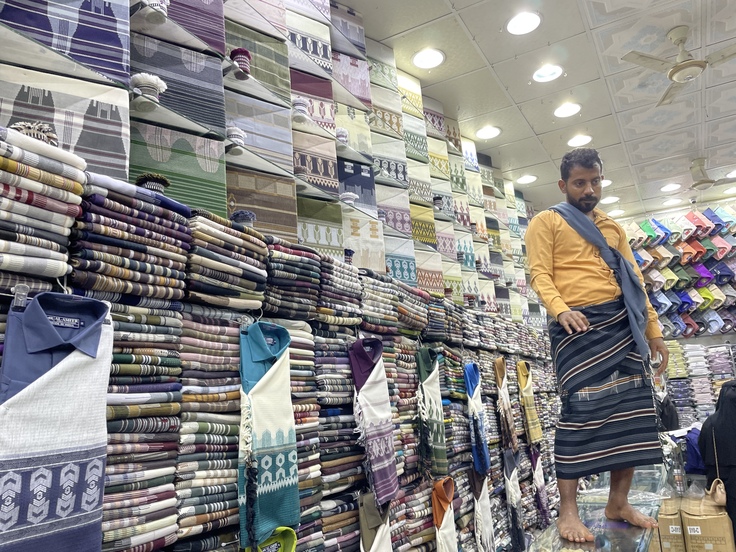 散策中、NMOのスタッフが「ちょっと寄って行ってもいい?」と入ったお店は、イエメンの男性たちの伝統衣装である巻きスカート「マウワズ」生地のお店でした。