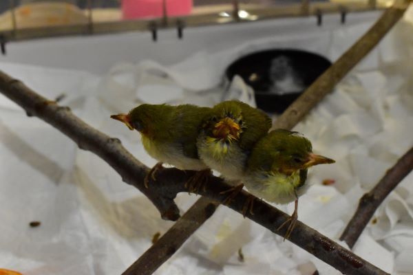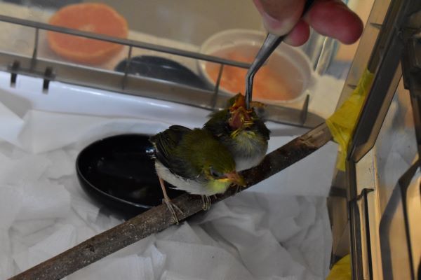 センターでは酸素室で保温をしながら強制給餌を行っていますが、3羽とも若干食べが弱いのが気になります。