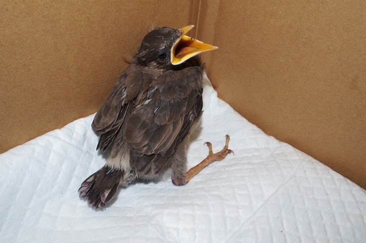 下の写真のように、羽がまだ生え揃っていない雛や、翼や尾羽が短く、くちばしもまだ黄色、または白い状態の雛が、何らかの理由で巣から落ちてしまうことを“落巣”と言い、そうなってしまった雛のことを落巣雛と言います。