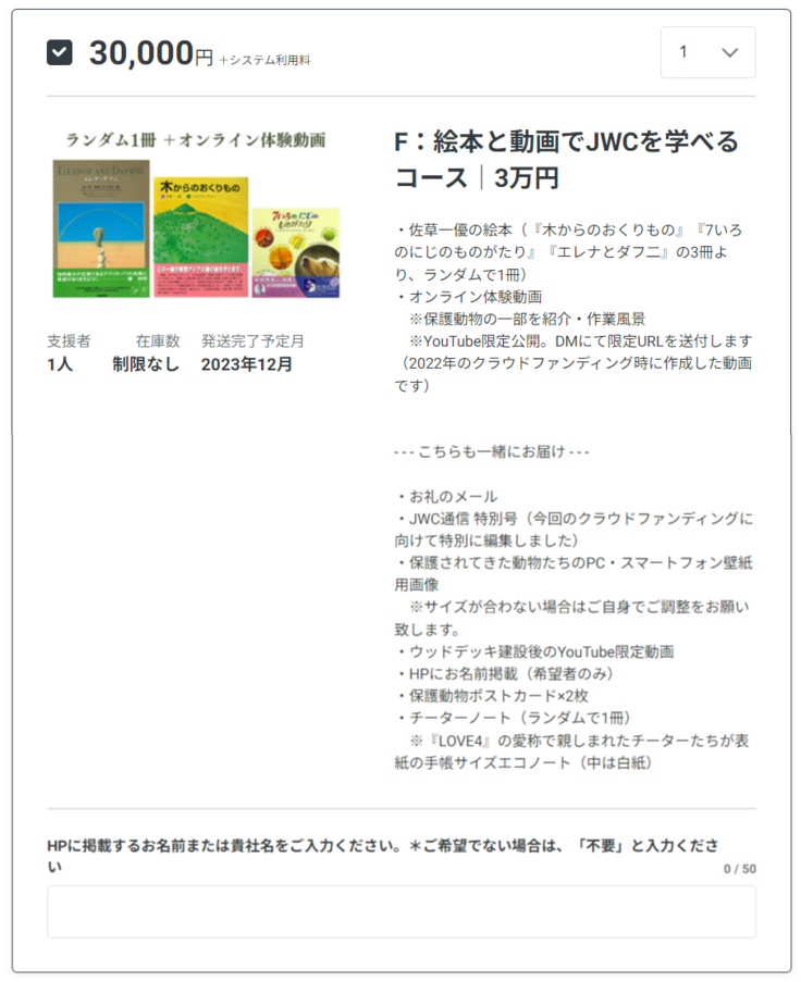 B:【リターン不要の方向け】お気持ちコース:1万円