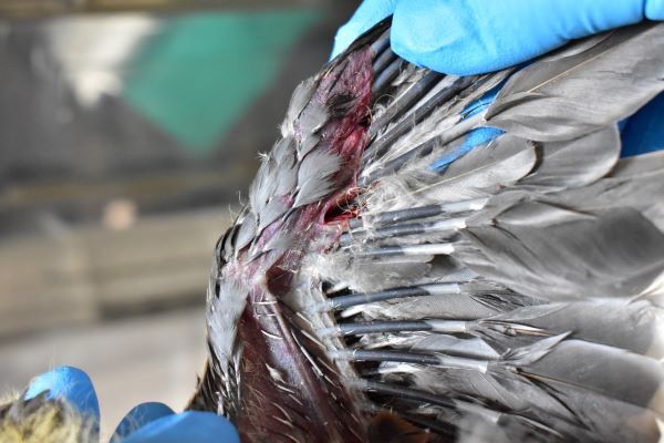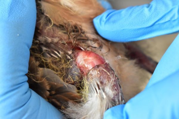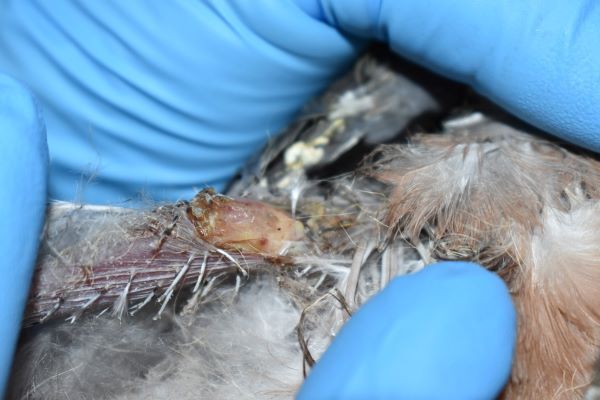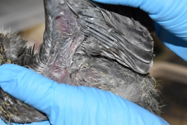 保護当初、まだ体には黄色い産毛が生えていて、左翼と右脚の付け根に裂傷が見つかりました。