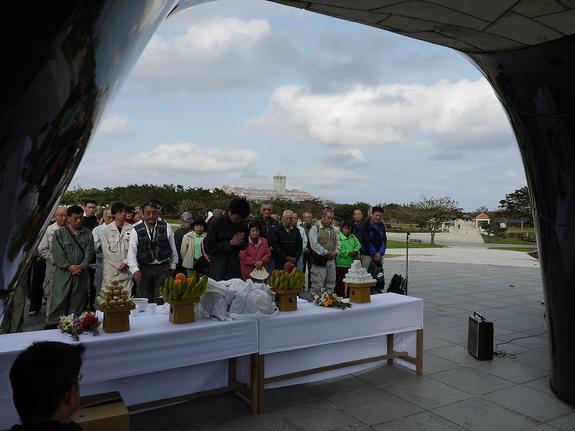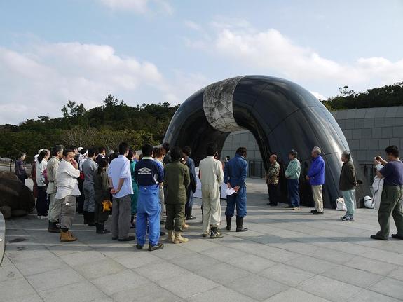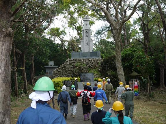 遺骨収集活動後、白梅の塔を見学し、慰霊を行う学生達