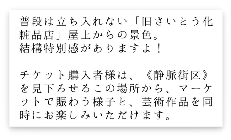 マーケットに来た人が、ふらっと《静脈街区》に立ち寄り、《静脈街区》に来た人がマーケットで買い物をする。そんな「暮らしとアートの共存」を体感していただけます。
