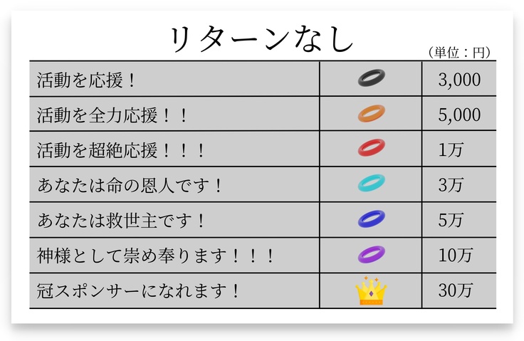 - 必要金額と目標金額の差額は、企業様の協賛金、助成金、自己資金によって補填いたします。