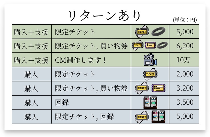 ※プロジェクト成立後、天災等やむを得ない事情(緊急事態宣言などコロナウイルスによる影響を含む)によりイベントが開催できなかった場合、ご支援いただいたお金は延期開催のために使用いたします。