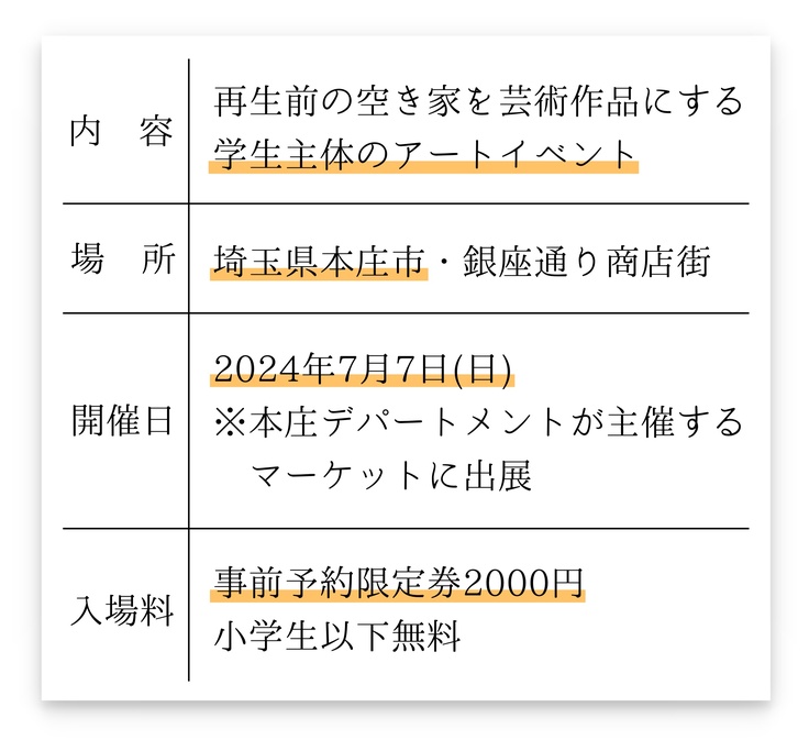 [概要] 埼玉県本庄市・銀座通り商店街周辺の再生前の5つの空き家を芸術作品にする学生主体のプロジェクト。作品化された空き家は、「本庄デパートメント」が主催する7月7日のマーケットに出展します!本プロジェクトを通して「暮らしとアートの共存」と「美術系学生の活躍の場の創出」を実現します! [主要メンパー] 田島史也(早稲田大学)…企画・運営などの事務的なこと+写真・映像制作 大加眞資(武蔵野美術大学)…企画+ビジュアル制作