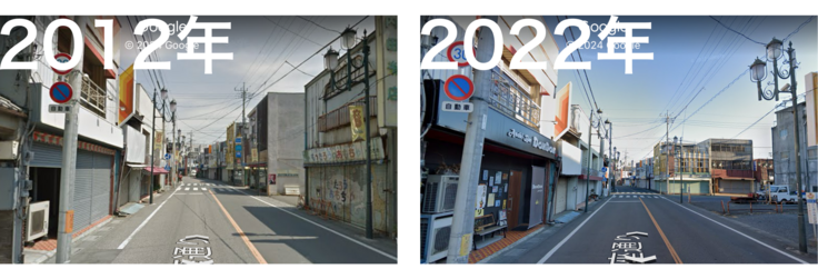 随分建物が減ってしまい、シャッターの閉じたお店が増えてしまいました。そんな変化に私自身、気づかずにいたのです。あとからGoogleマップで比べて初めて、その変化に気がつきました。