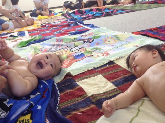 (南三陸町は津波被害が大きく、町はまだまだ復興途中です。他の国から支援で頂いたキルトの上でベビーマッサージをしました。)