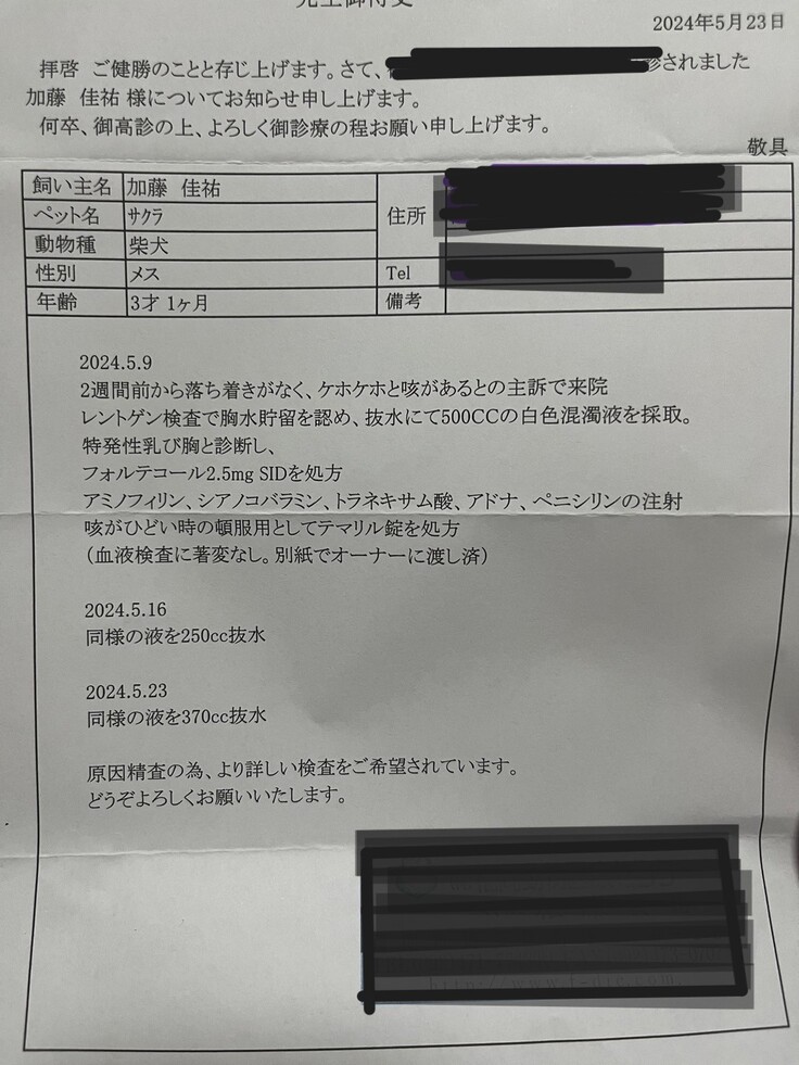 愛犬サクラの突発性乳び胸の手術をします。手術内容:胸腔鏡下胸管結紮術、胸腔鏡下心膜切除術、腹部乳び槽切開術 入院期間3日間(体調により延長7日間程度) 手術費用:診察、検査、麻酔管理、手術、投薬、入院、税抜き40万円前後(入院延長1日あたり1~1.5万円)を支払います。 すでに手術は完了しており自己資金などで支払済。支援金は既に支払った費用に補填いたします。