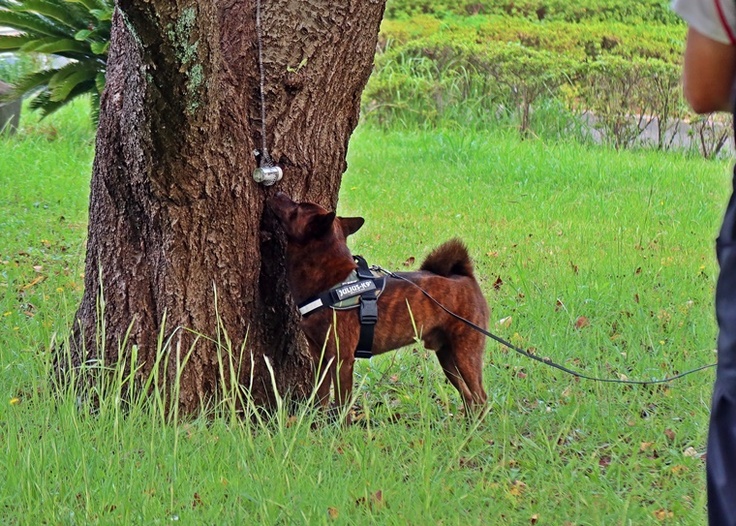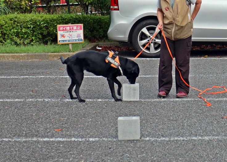この日、捜索犬たちは確実に臭気のもとに行きアラート(告知・ピンポイントに鼻先を臭気に向けて止まる)する基礎訓練を行いました。