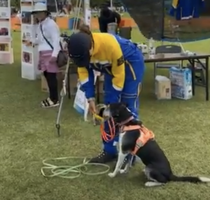 ②トレーリングのデモでは、8歳のボーダーコリーMIXのゼルダが登場。メンバーの1人が認知症高齢者役となり、大勢の人や犬が行き交うところを歩いて行きます。イベントのデモということもあり、数時間経ってからスタートするわけにもいきませんので、10分弱経ったところでゼルダがスタートします。ゼルダもハンドラーも行方不明者がどこにいるか知りません。スタート時に行方不明者役からもらった靴下を嗅ぎます。これで特定のその人を探すということを犬に知らせます。犬はその靴下と同じ臭いを探していきます。風によって匂いの広がり方が違いますが、ゼルダを行方不明者役が歩いたルートをジグザグに臭いをとっていました。動画がInstagramにありますので是非ご覧ください。(k9nsa2023) 行方不明者に辿り着いたゼルダは、追ってきた臭いと同じであるということを知らせるためにその人の前で静かに座ります。高齢者や犬が苦手な人や子どもたちだった場合、吠えるとびっくりして転んだりしてケガをしてしまうことにもなるので、座るアラートをしたらご褒美のオヤツをもらいます。