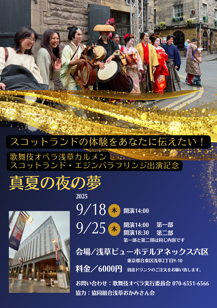 このたび、皆さまの温かいご支援のおかげで、オペラ×歌舞伎『浅草カルメン』は無事にエディンバラ・フェスティバル・フリンジでの公演を終えることができました。日本文化とオペラの融合という挑戦が、世界の舞台で大きな反響を得られたのは、ひとえに応援してくださった皆さまのお力添えの賜物です。
