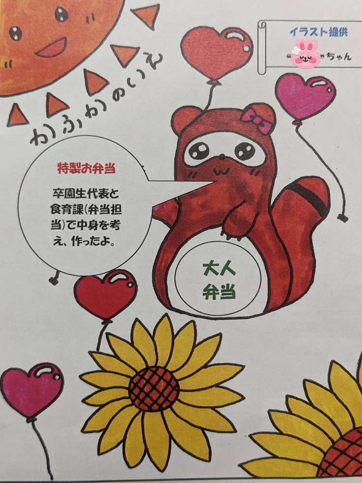 鹿深まつりでは毎年、卒園生と食育課で『卒園生屋台』を出し、日頃、お世話になっている皆さんに軽食をご準備させて頂きましたが、今年度は数年ぶりの開催となった為、午前中で閉会となり残念ながら、屋台を出すことは出来ませんでした。しかし、卒園生で居酒屋を経営している子が子ども達と職員の昼食のお弁当を作ってくれました。また、お弁当の包み紙は子どもがイラストを描いてくれました。
