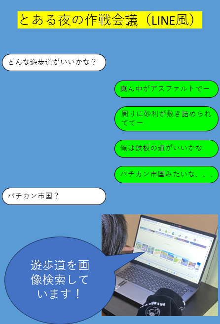 その日の夜、早速子ども達にニュースを伝えると共に、これから整備計画がスタートする遊歩道について、「どんな遊歩道がいいかな?」と尋ねてみました。