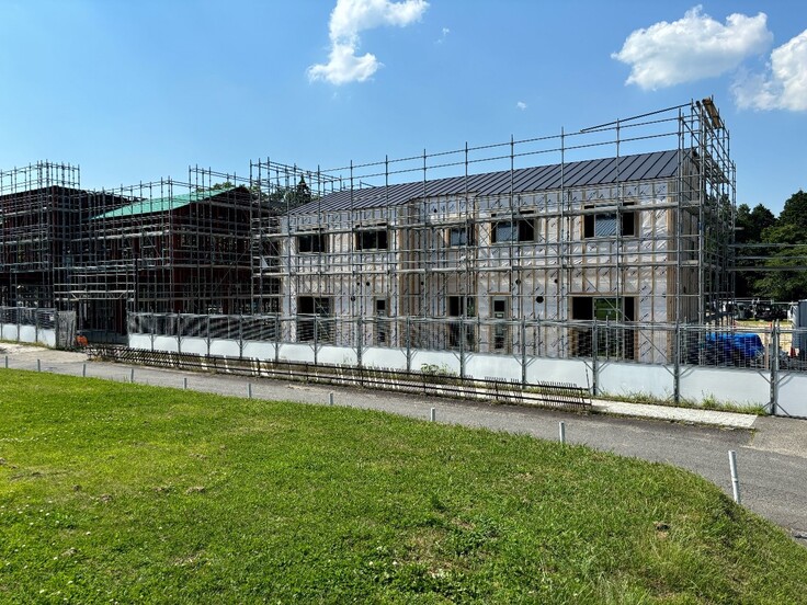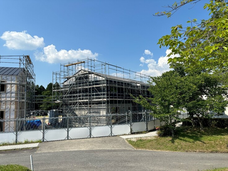 さて建築の近況ですが、いよいよ外装が見えてきました。
