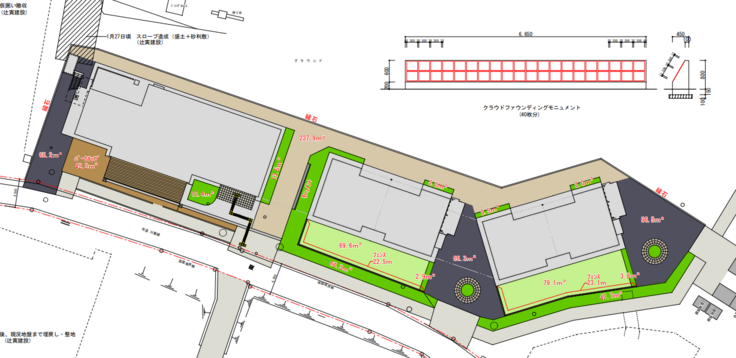 ・図の右上にある赤い四角は、クラウドファンディングの返礼品の一つであった手形をあしらったモニュメントを表しています。こちらについては、本館と男子ホームの間に設置される予定です。