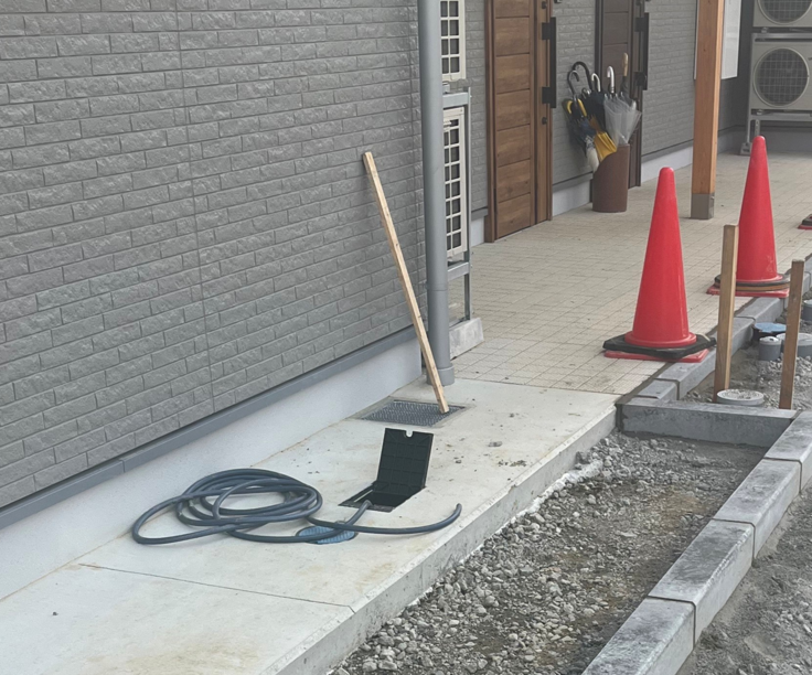 植栽ゾーンと舗装のための事前準備中。ドロドロの土を玄関内に持ち込む日々ともうすぐお別れです。