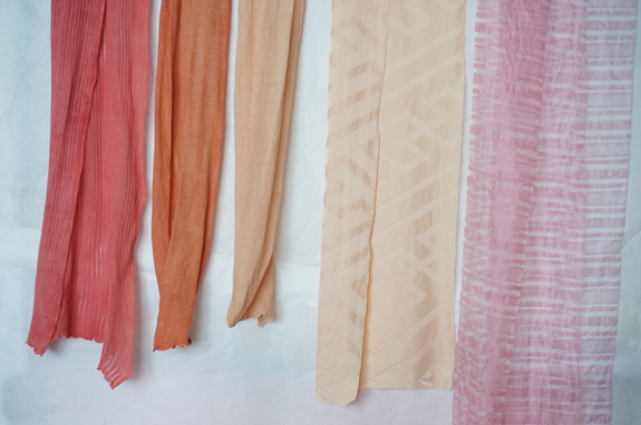 本プロジェクトで製作するブドウの染料を用いてストール(30×130cm)をお作りします。使用する生地は世界で一番薄くて軽いと言われるハイテク素材「天女の羽衣」です。なめらかな肌触りと軽い着け心地のストールです。