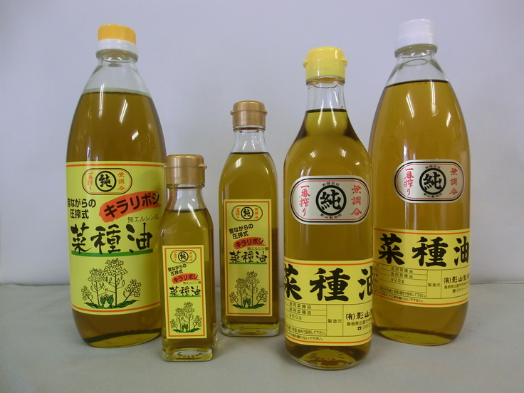 農研機構から無エルシン酸の菜種原種を利用する許可を得て他のアブラナ科植物と交雑しないように自社の隔離圃場で原種を隔離栽培し、出来た種子を増殖してから契約農家に提供し、生産された菜種を原料として圧搾一番搾りした菜種油です。