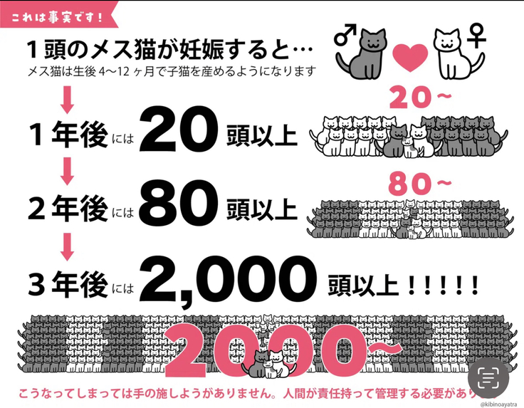 飼い主が何とかしなければ、と気づいた時には、手のつけられない数になっている、と考えます。