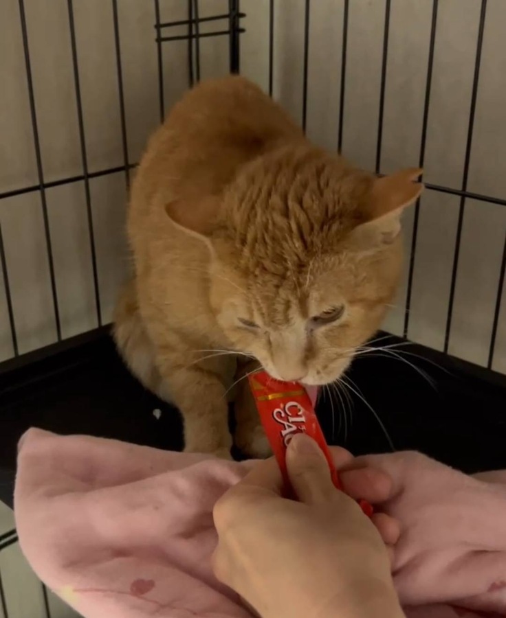 警戒しながらも 預かりボランティアさんの手からチュールを食べれるようになりました ㊗️