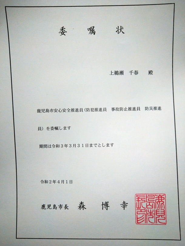 (画像…本日郵送で届いた市の安心安全推進員の委嘱状)