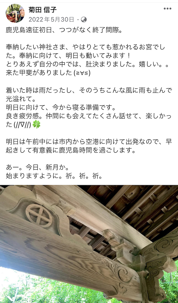 最終日を決める時には意識していなかったのですが、ちょうど1年目の5月30、31日は一泊二日で鹿児島にいました。この鹿児島・長田神社様への初参拝旅行でした!