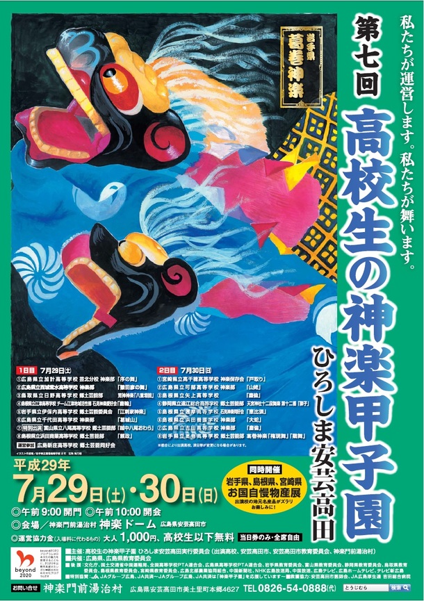 全国的にどの神楽団も後継者確保に苦慮されています。長く受け継がれてきた神楽を残すため、今、高校生たちが頑張っています。そんな全国の神楽部で頑張る高校生たちが集い、互いに刺激しあい、貴重な交流の場となっているのが、「神楽甲子園」です。平成23年度から開始し、今年で7回目の開催になります。「甲子園」という名前ではありますが、互いの文化を認め合い、尊重しあうことのほうが重要と考え、順位はつけていません。