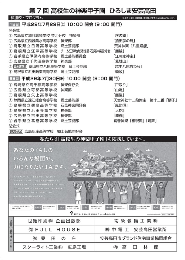 ページを御覧いただき、ありがとうございます。神楽甲子園実行委員会です。広島県は全国でも有数の神楽(かぐら)どころで、なかでも非常に神楽が盛んな安芸高田市では、毎年7月に、全国各地から神楽に青春をかける高校生が集まり、2日間に渡り神楽を披露する「神楽甲子園」が開かれています。
